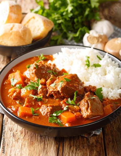 stew, beef, rice, vegetable, herb, bowl, rustic, wooden, table, food, cookery, dish, hearty, meal, dinner, appetising, flavorful, cooked, hot, delicious, comfort