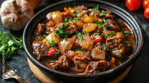 beef, stew, tomatoes, onion, clay, pot, mediterranean, cookery, food, meal, dinner, epicure, tasty, savoury, cooked, red, green, herb, traditional, kitchen, dish, receipe, eatery, culinary, closeup, photo, nourishment, delicious, healthy, fresh, ingredient, meat, vegetable, seasoning, culture, rustic, garnish, parsley, brown, dinnerware, favor, rich, hearty, warm