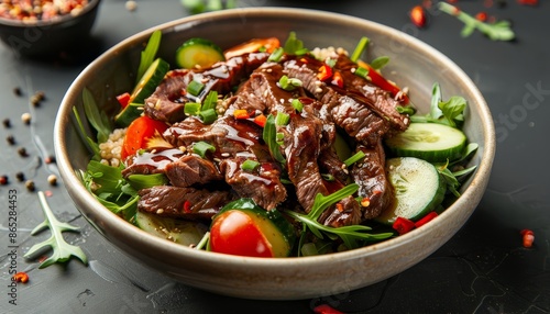 Beef teriyaki salad with fresh tomatoes cucumbers paprika arugula and lettuce in a bowl
