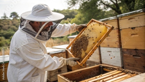 apiarist, bee, beehive, honeycomb, frame, apiary, beeswax, agriculture, rural, insect, farming, harvesting, environment, nature, summer, men at work, inspection, hive, natural, light, intricate, buzzing, diligence, meticulous, focused, attention, hobby, practice, working, engaged, occupation, industry, honey, organic, healthy, sustainability