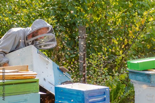 apiarist, carries, unit, beehive, styrofoam, summer, work, apiary, hive, racked, honey, harvesting, expansion, bee, colony, empty, group, material, many, land, horizontal, dirty, colours, flocked, closeup, close, carry, puckered, paint, blue, sunny, rectangle, rectangular, rustic, sun, sunlit, wing, bee, walk, surface, village, apiculture, yellow, closeup, plate, entrance, entry, shade, crawl, animal