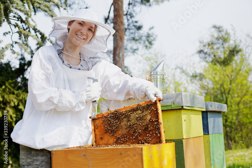 apiarist, apiculture, honey, honey bee, honeycomb, inspecting, bee, beehive, apiarist, apiary, apiculture, apiarist, beeswax, biology, brown, care, mobile phone, cell, clothing, comb, farm, farmer, female, food, frame, happy, hive, holding, nature, people, protection, protective, smile, spring, summer, swarm, wax, woman, men at work, young, agriculture
