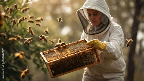 Beekeeper in protective bee suit working at apiary, holding honeycomb with swarm of bees flying above. Beehives in garden
