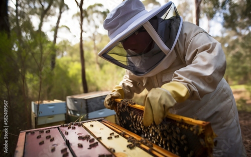 apiary, apiculture, man, honey, useful, health, floral, bee, home, men at work, healing, sweet, thick, amber, gold, person, 1, industry, camouflage, generative, ai, apiarist, beehive