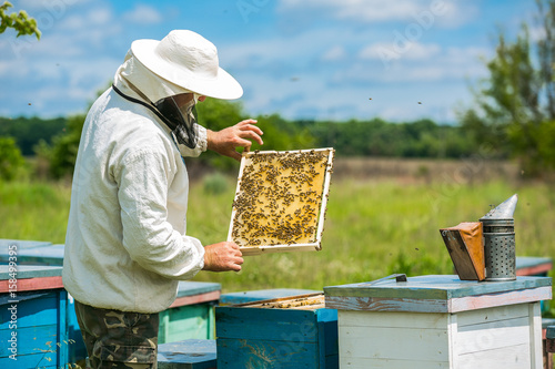 Beekeeper is working with bees and beehives on the apiary. Beekeeper on apiary.