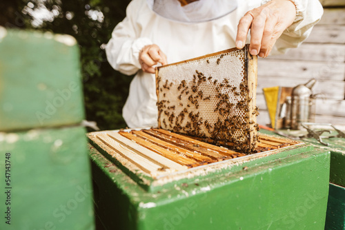Beekeeper removes a honeycomb from the hive