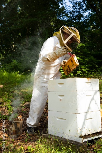 man, young, adult, caucasian, apiculture, beehive, honeycomb, 1, alone, apiarist, outdoors, day, lifestyle, hold, mask, smoke, people