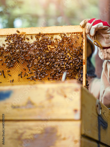 Beekeeper with honeycomb frame by beehive. Inspection of the state and conditions of bee colony. Production of golden organic clean product for food consumption. Popular hobby. Warm sunny soft mood.