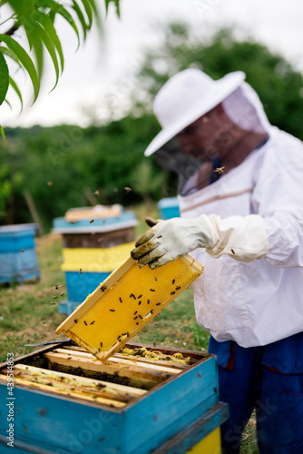 agriculture, animal, apiarist, apiary, apiculture, bee, beehive, apiarist, apiculture, beeswax, collect, colony, comb, daytime, farmer, farming, flying, food, frame, garden, gathering, glove, harvest, hat, hive, hobby, hold, honey, honey bee, honeycomb, male, man, many, nature, organic, outdoors, passion, person, pollen, product, profession, propolis, protective clothing, removable, sunshine, swarm, veil, wax