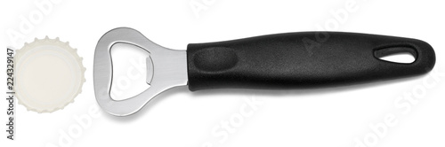 Beer bottle opener and cap isolated on white background. Flat lay, top view