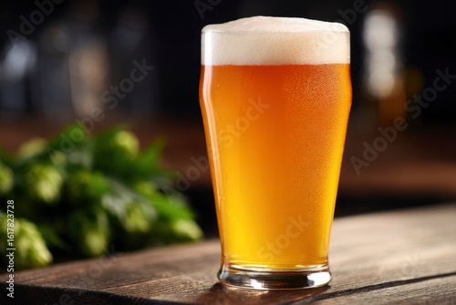 Beer in a glass with hop buds in the background sitting on a wooden surface