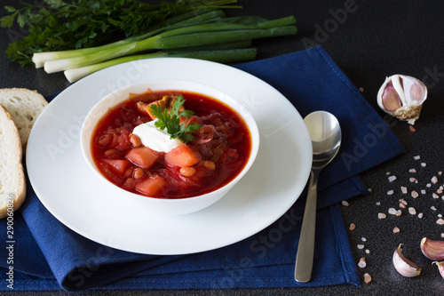 Beetroot soup. Traditional Ukrainian and Russian cuisine, soup cooked with beets and tomatoes.