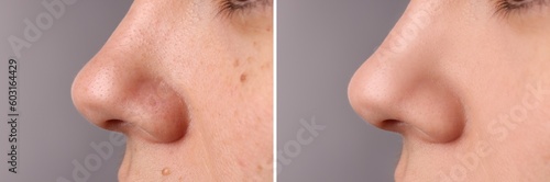 Before and after acne treatment. Photos of woman on grey background, closeup. Collage showing affected and healthy skin