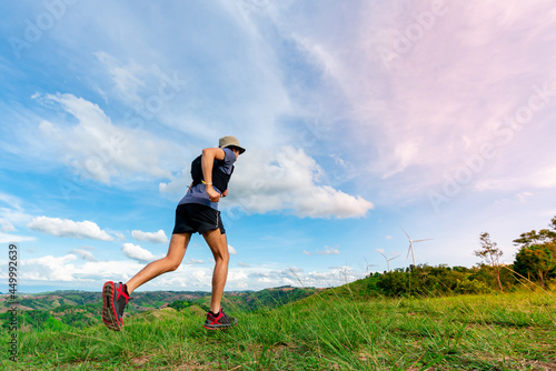 Behind the Asian male trail runners, wearing sportswear, are practicing running on a high mountain behind a beautiful view. There is a field of wind turbines generating electricity in the background.