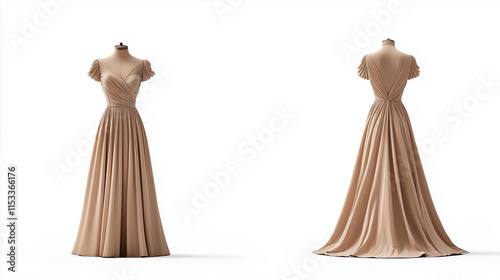 Beige formal dress mockup front and back view isolated on white background for brand presentation