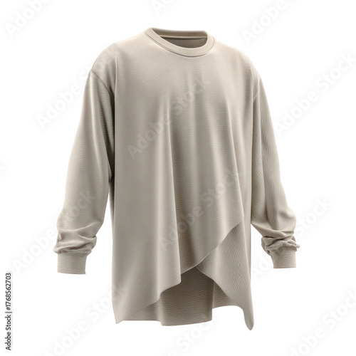 t-shirt, long, sleeve, beige, clothing, apparel, fashion, garment, top, shirt, crew, neck, casual attire, menswear, unisex, style, design, fabric, textile, material, studio, shot, isolated, transparent, background, template, asymmetric, hem