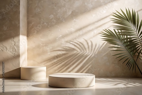 Beige Minimalist Product Display: Two Cylindrical Platforms, Palm Leaf Shadow, Sunlit Wall