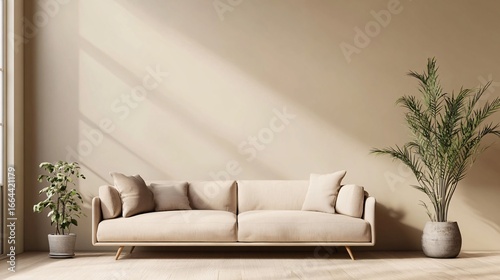 sofa, couch, pillow, cushion, plant, potted plants, interior, room, living room, beige, cream, neutral, sunlight, light, shadow, wall, floor, wooden floor, modern, contemporary, minimalist, home, decor, decoration, furniture, indoor, design, comfortable, relaxation, apartment, house, style, elegant, simple, clean, empty, nobody, serene, calm, peaceful, tranquil, minimal, aesthetic, stylish, domestic, residence, dwelling