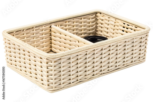Beige woven plastic storage basket with two compartments isolated with transparent background