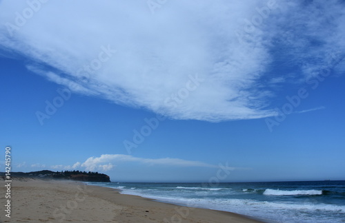 Belmont Nine Miles beach on a cloudy day in summertime. Redhead Point in the background (Central Coast, NSW, Australia).