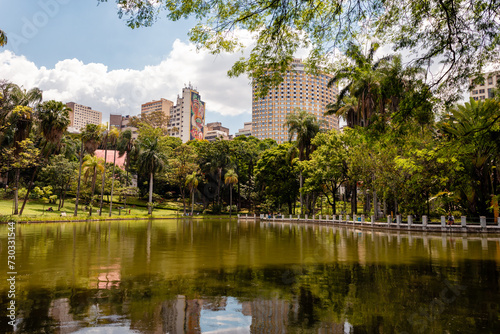 Belo Horizonte Municipal Park, during a beautiful sunny day with the sky's clouds reflected in the lake.