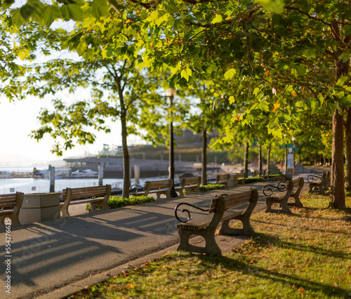Benches sit under full trees along a trail in a waterfront park at sunset; Vancouver, British Columbia, Canada