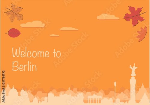 Berlin silhouette autumn leaves. Skyline illustration, clouds, bridge, collage icon, city panorama river