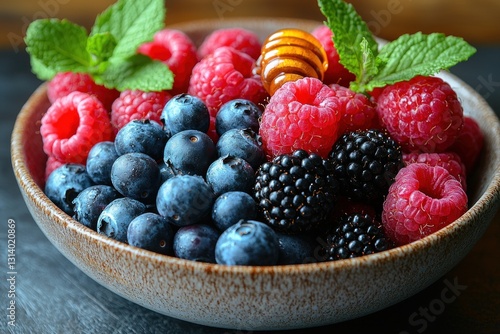 Berries in bowl Raspberries, blueberries, blackberries with honey and mint, close-up