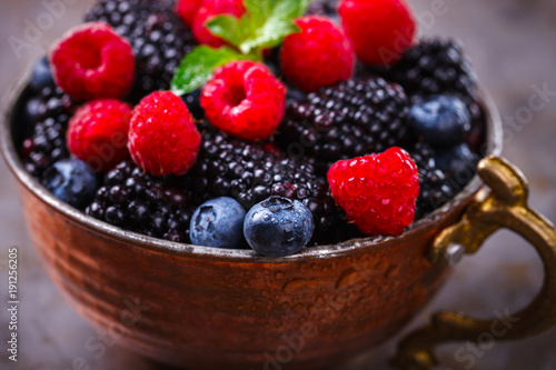 Berry Fresh in a copper cup on the Metal Background. Blackberries,Bramble,raspberry with mint.Food or Healthy diet concept.Super Food.Vegetarian.Copy space for Text.selective focus.