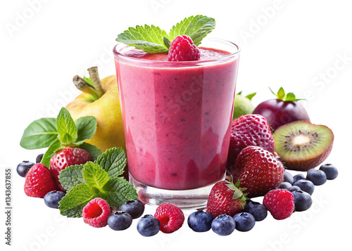 Berry smoothie in glass with fresh fruits - A vibrant berry smoothie in a clear glass, garnished with a raspberry and mint, surrounded by fresh fruits, isolated on white.