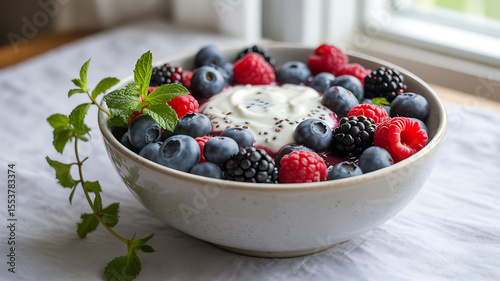 Berry Yogurt Bowl with Chia Seeds and Mint