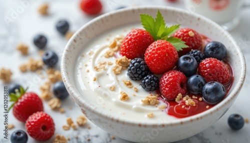 yogurt, berry, parfait, granola, raspberry, blueberry, blackberry, breakfast, healthy, food, bowl, dessert, sweet, creamy, fruit, summer, delicious, receipe, morning, eat, dietary, vitamin, antioxidant, nature, fresh, taste, texture, mix, red, purple, white, spoon, table, kitchen, lifestyle, energy, meal, snack, diet, well-being, organic, natural, deliciously