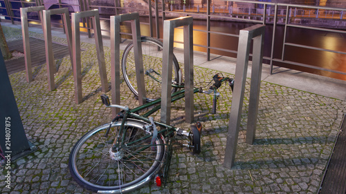 Bicycle resting along a city canal at night, in Berlin, Germany.