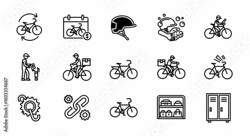 bicycle, service, line, icon, vector, subscription, helmet, cleaning, mechanic, delivery, customization, spare, part, storage, locker, thin, linear, illustration, repair, maintenance, bike, safety, gear, cycling, transport, accessory, wheel, tire, chain, pedal, frame, tool, shop, rental, urban, sport, commuter, secure, lock, adjustment, workshop, handlebar, pump, eco, ride, active, cycle, mobility