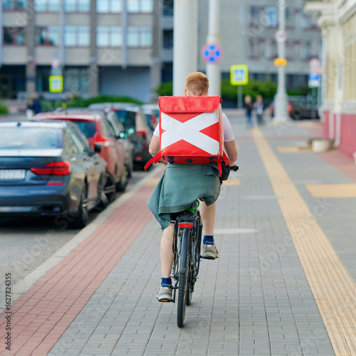 Bicyclist delivering food in red thermal backpack. Food delivery cyclist rides fast through sidewalk wearing red backpack. Food delivery service