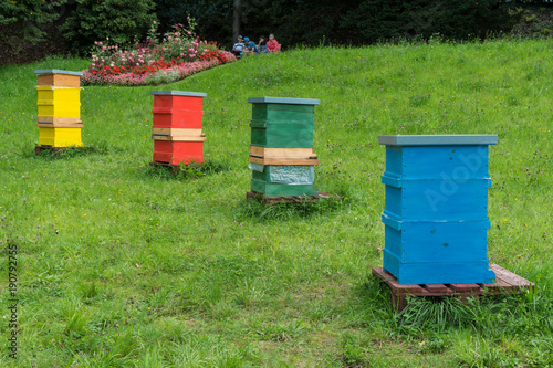 bee, honey, apiarist, apiary, wooden box, sting, yellow, red, green, blue, meadow, allergy