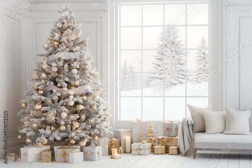 Big beautiful christmas tree decorated with beautiful shiny baubles and many different presents on white wooden floor