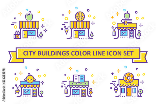 Big City Shop and Store Building color line icon set. Vector illustration, flat style.