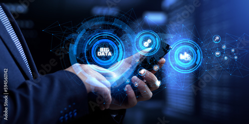 Big Data Analysis Analytics internet technology concept. Businessman pressing button on screen.
