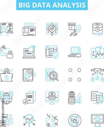 Big data analysis vector line icons set. Analytics, Mining, Storage, Patterns, Visualization, Machine-learning, Clustering illustration outline concept symbols and signs