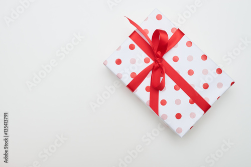 Big dotted gift box with red ribbon and bow tie