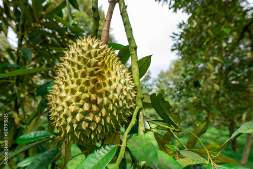 Big durian on the branch in the garden blurred background, agriculture in Thailand, product for export, king of fruit, advertising concept