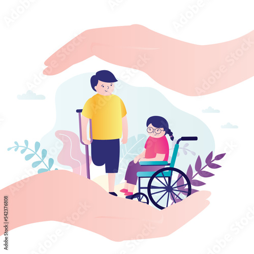 Big hands protective children with disabilities. Schoolboy without leg with crutch. Cute small girl sits in wheelchair. Concept of disabled care, protection, healthcare.