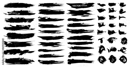 Big set of black textured smooth and curly strokes isolated on white background 52 elements
