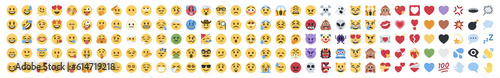 Big set of yellow emoji. Funny emoticons faces with facial expressions. On transparent background.
