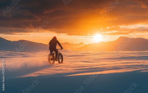 bicyclist, winter, sunset, snow, mountain, adventure, landscape, biking, nature, exercise, evening, cold, scenic, horizon, exploration, travel, sport, sky, fresh air, freedom, thrill, cold weather, beauty, peaceful, snow-covered, ride, activity, wilderness, scenery, recreation, warmth, golden hour, solitude, natural light, breathtaking, immensity, fun, journey, life events
