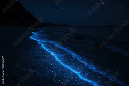 bioluminescence, beach, ocean, night, star, water, wave, blue, glowing, plankton, coastline, shore, darkness, sea, nature, travel, vacation, tropical, sky, sand, scenic, dark, landscape, summer, dreamlike, mystical, algae, light, underwater, seascape, coast, tour tourism, tranquil, marine life, science, phenomena, phenomena, microbiology
