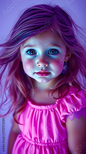 Bioluminescent colors, deep ultraviolet hues. Fine art photograph of an adorable girl with flowing hair, glossy eyes, rosy cheeks, and freckles, wearing a charming dress. Full body, white background.