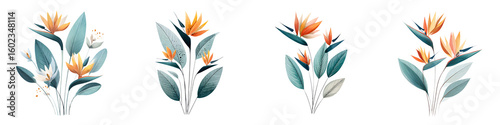bird of paradise, flower, flower, floral, arrangement, watercolor, tropical, plant, leaf, illustration, botanical, drawing, design element, summer, exotic, clip art, isolated, white background, decorative, postcard, invitation, wedding, pattern, textile, wallpaper, graphic, art, painting, hand-drawn, colourful, digital artwork, creative, stylish, fresh, vibrant, modern, floral pattern, set