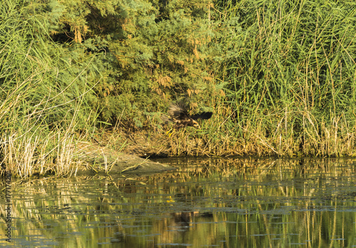bird of prey in flight searching and hunting above a pond